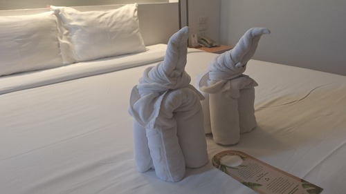 象祭りで有名なスリン。ホテルもタオル細工の象でお出迎え。